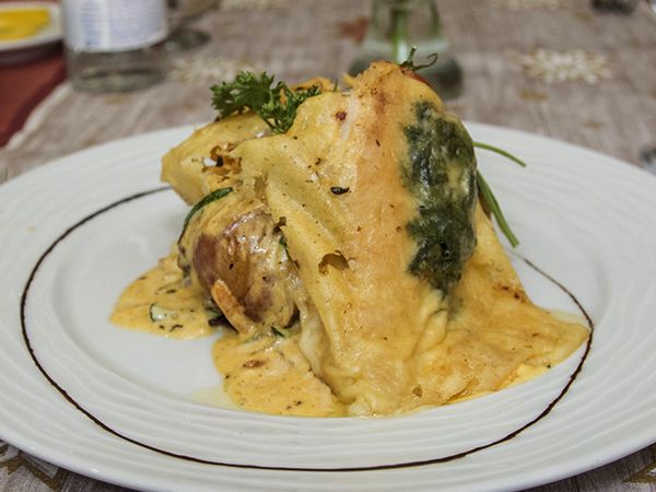 Parajos sajtban sült csirkemell steak, császárszalonnás hordóburgonyával, vajban sült zöldségekkel, camembertes hollandi mártással