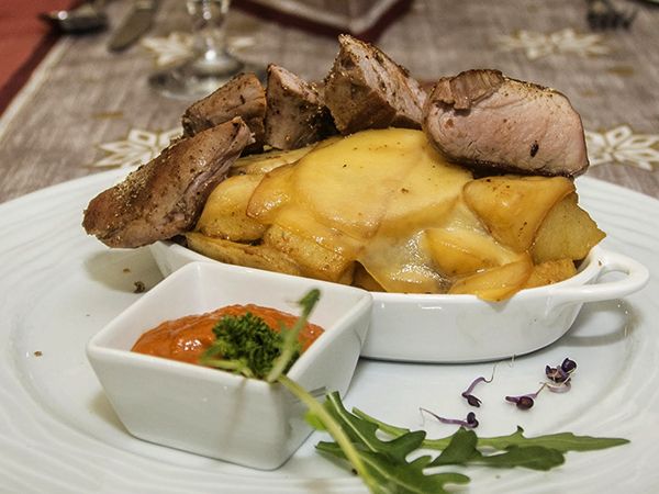 Vargányakéregben sült mangalica szűz márványsajtos, pirított hagymás burgonyatortával, forró, sült vajbab tatárral